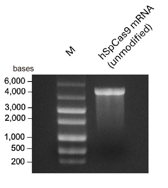 hSpCas9 mRNA (unmodified) was analyzed on a 1% TAE agarose gel at 100 V for 30 minutes.