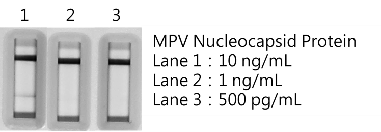 Figure 1. Testing for Human Metapneumovirus (MPV) Nucleocapsid Protein, His Tag, E. coli with the Human Metapneumovirus Nucleocapsid Protein Antigen Rapid Test.