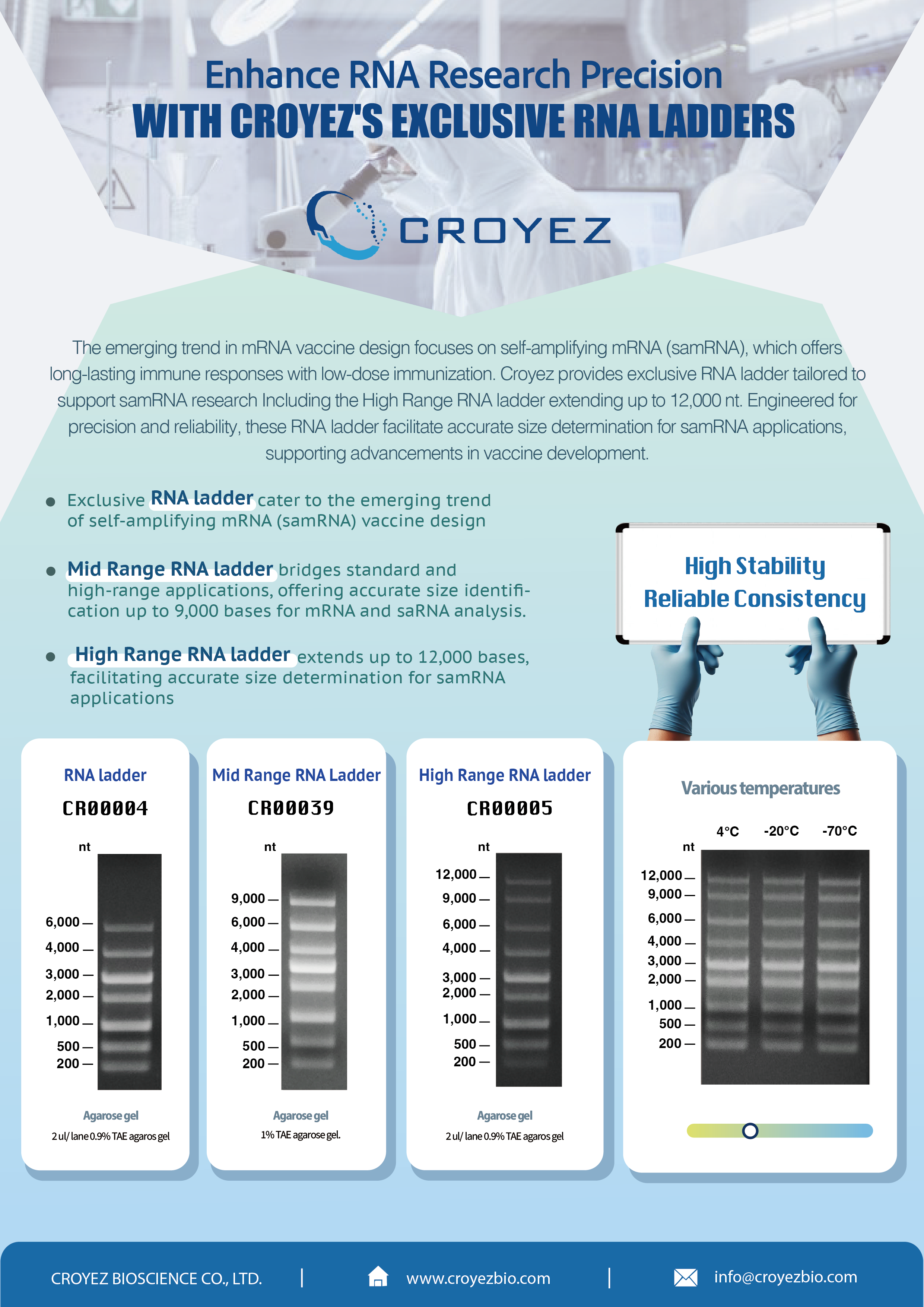 The emerging trend in mRNA vaccine design focuses on self-amplifying mRNA (samRNA), which offers long-lasting immune responses with low-dose immunization.Croyez provides exclusive RNA ladder tailored to support samRNA research Including the High Range RNA ladder extending up to 12,000 nt. Engineered for precision and reliability,these RNA ladder facilitate accurate size determination for samRNA applications, supporting advancements in vaccine development.