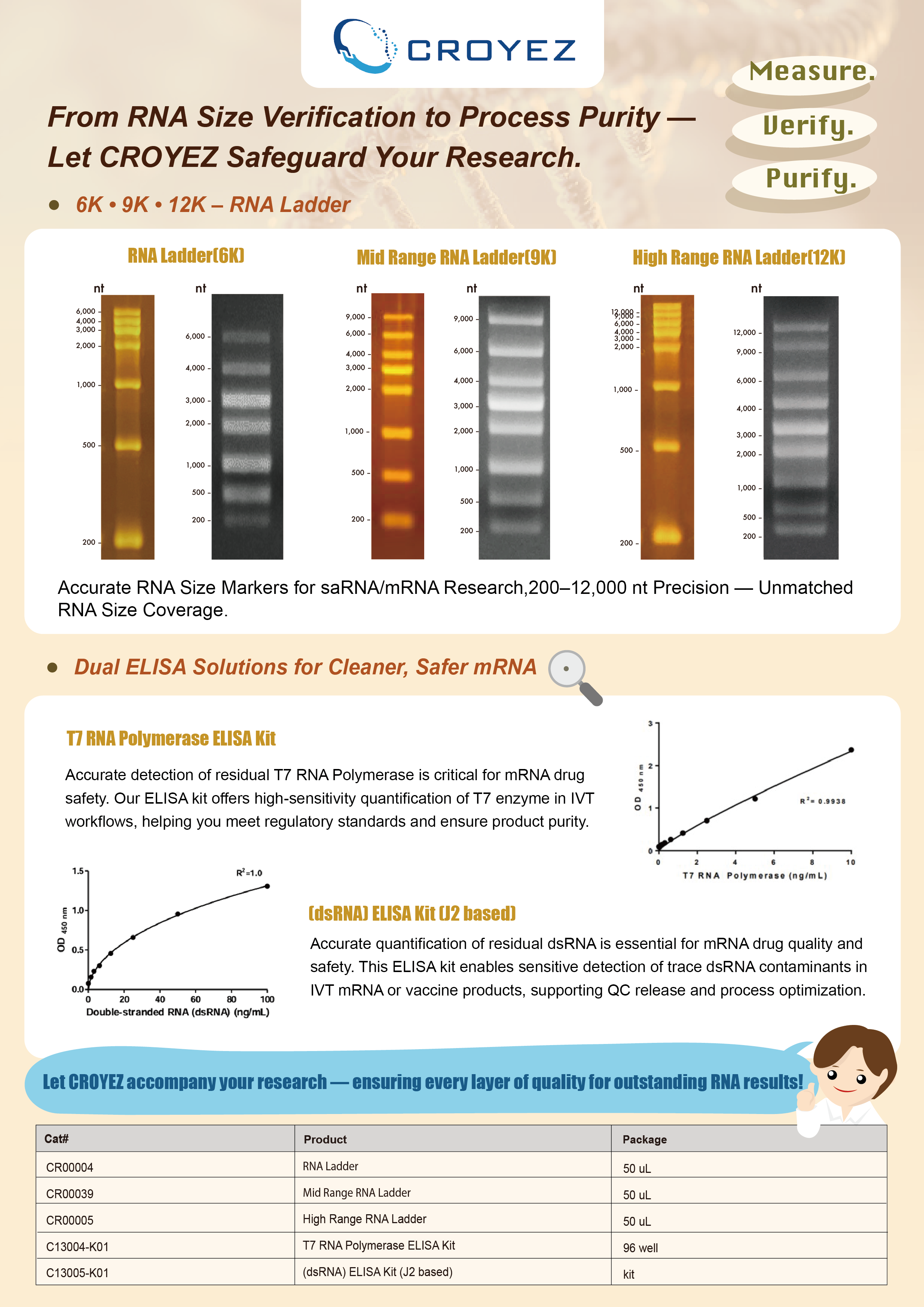 Croyez provides comprehensive RNA quality tools — from RNA Ladders for precise transcript size verification to ELISA-based QC kits for detecting impurities such as T7 RNA polymerase and dsRNA.